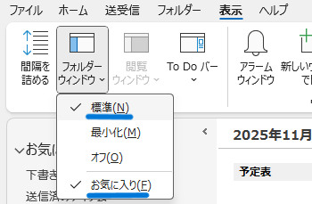 Outlookのビュー設定で「非表示」や「縮小表示」になっていると、フォルダが見えなくなります。