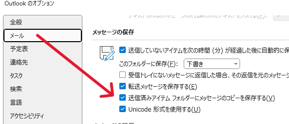 3.「メッセージの保存」項目の「送信済アイテムフォルダーにメッセージのコピーを保存する」