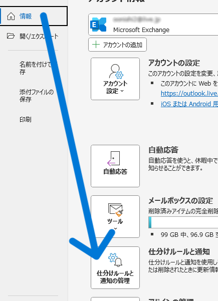 同様に、「ファイル」「情報」仕分けルールと通知の管理」を開き、右上の [オプション] をクリックします。
